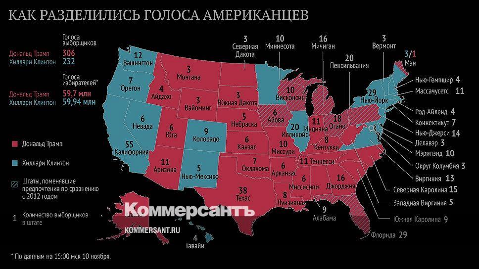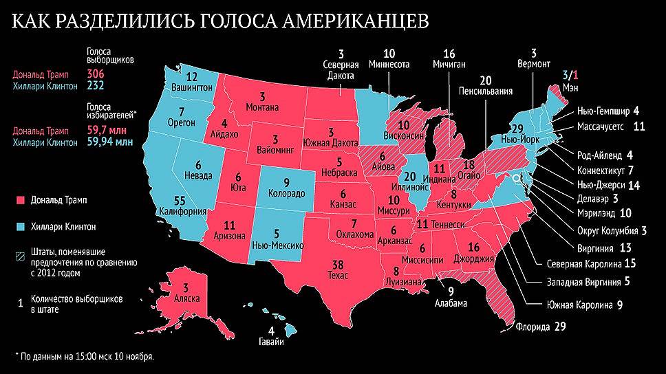 Взгляды Дональда Трампа в основном разделяют белые американцы (58%). Политика Хиллари Клинтон оказалась ближе нацменьшинствам: ее поддержали 88% чернокожих избирателей, 65% латиноамериканцев и выходцев из Азии.