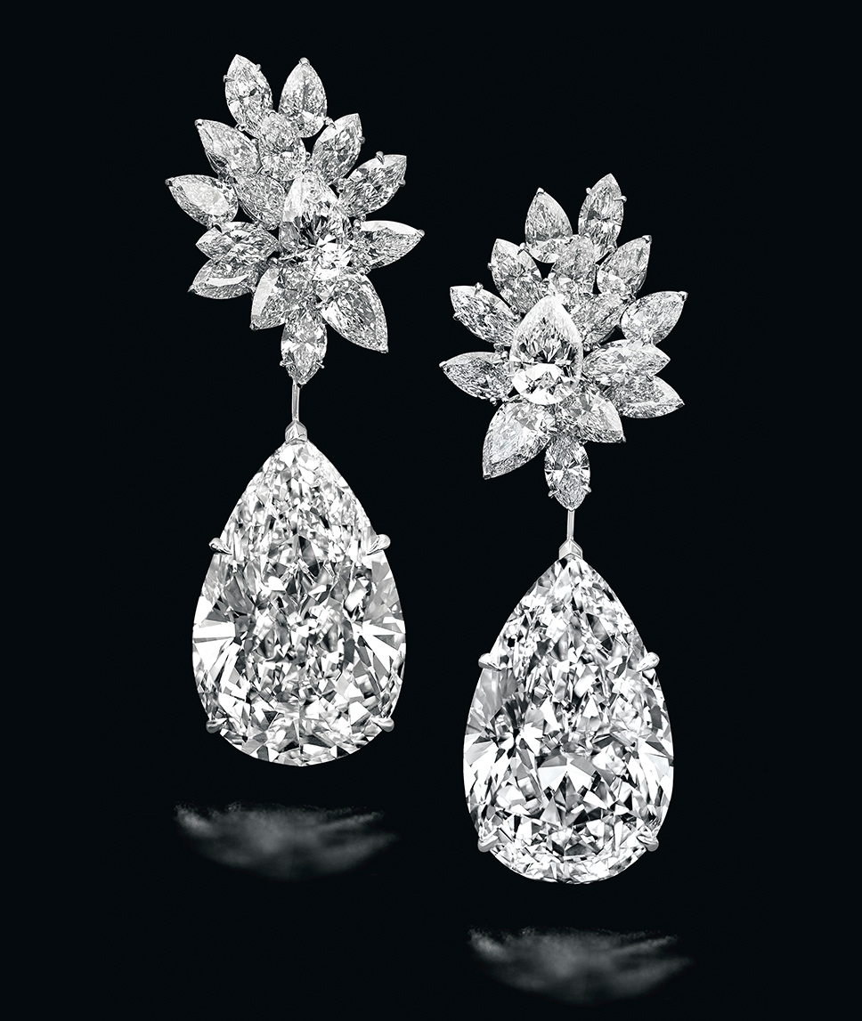 Первый лот — серьги с крупнейшими в аукционной истории «беспорочными» бриллиантами грушевидной огранки под названием «Зеркало амура». Вес бриллиантов цвета категории D составляет 52,55 и 50,47 карата. Грушевидные подвески крепятся к композиции из 30 бриллиантов огранки «маркиза» общим весом 20,41 карата. Оценочная стоимость серег составляет $20–30 млн.
