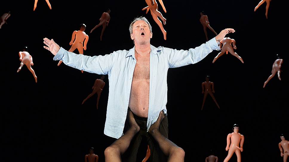Режиссер отнял у двух актеров все, что мог отнять: спектакль играется практически на пустом планшете сцены. Героям оставлены только текст и пространство. Постоянный соавтор Персеваля художник Катрин Брак в данном случае выполнила служебную функцию. Брак часто создает интересное оформление спектакля из повторяющихся одинаковых элементов. В том же "Тонелгруп Амстердам" для спектакля Персеваля по роману Кутзее "Бесчестье" она заставила сцену одинаковыми манекенами — как образ равнодушного большинства. Что-то подобное сделано и в "Годе рака": но здесь надувные пластиковые куклы обнаженных мужчин не стоят, а висят, заполняя всю сценическую коробку. Они похожи на товар из секс-шопа, но пенисы растут из пупков, и антиэротичность объектов словно обостряет замысел — когда люди и вправду любят друг друга, все прочие тела в мире теряют привлекательность. Надо, однако, сказать, что актеры "развеску" почти никак не отыгрывают, разве что героиня однажды выпускает воздух из типового "мужчины" и засовывает себе в колготки резиновый комок.