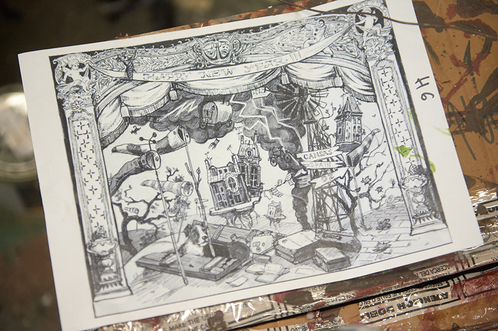 Даниил задает общий вектор: «Команда всегда работает, учитывая мои пожелания по стилю. Не хочу барокко — хочу декаданс. И таких желаний у меня обычно очень много. Перед тем как садиться рисовать эскизы, мы с командой обсуждаем все детали и мелочи сюжетов. Это самое творческое время в офисе». На эскизе отражена база, мебель, но мелкие детали опускаются. Каждый декоратор потом сам решит, что и в каких количествах будет использовать из сокровищ на складе.