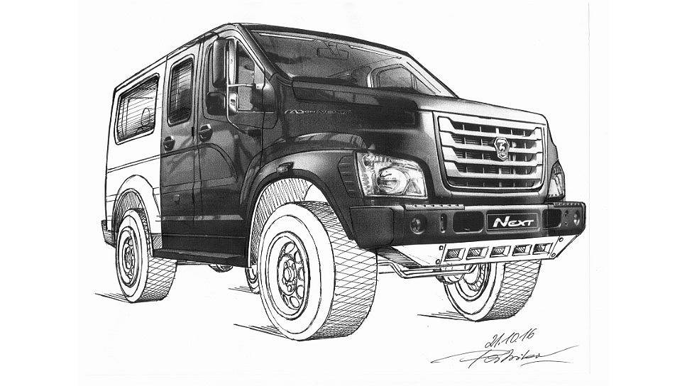 Посмотрите на скетчи. Перед вами оригинальная модель семиместного внедорожника с использованием полноприводного шасси «Соболь 4х4» и кузова, исполненного из уже имеющихся на ГАЗе в производстве кузовных панелей и элементов кабин семейства Next. Давайте дадим нашему проекту имя «ГАЗ Nexter 4х4».