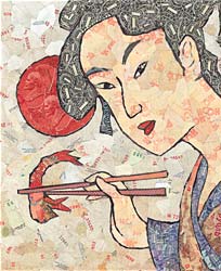 Не обошли своим вниманием демократичный сектор и владельцы "Изуми" — открыли три "Изуминки", по ценам соответствующие "Якиториям". Заметим, вывески вновь появляющихся ресторанов страдают однообразием. Как правило, эксплуатируется название основного продукта --"Суши весла", "Рис и рыба" или страны его происхождения — "Япона мама", "Японский городовой" (последнее заведение принадлежит фирме "Японский бог").