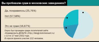 Словом, понятие японской кухни девальвировалось окончательно — при всем желании ее нельзя признать верным признаком дорогого заведения. Следуя логике развития рынка, вслед за японским фаст-фудом должны появиться и легкие в приготовлении полуфабрикаты суши. И такой проект уже существует. По словам Матвея Бриллинга, до конца лета он завершит строительство в Химках небольшого завода по производству замороженной японской еды — готовых блюд и полуфабрикатов. Господин Бриллинг обещает, что уже осенью новый продукт появится на прилавках крупнейших московских супермаркетов. И тогда суши можно будет считать такой же традиционной пищей, как блины и пельмени.