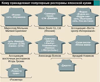 Следующий японский ресторан в Москве — "Фудзи" — появился в середине 90-х и тоже относится к категории дорогих. Его открыл предприниматель Александр Королев, бывший партнер Nisso Boeki. В "Фудзи" вкладывали деньги сегодняшние хозяева "Навруза", "Кармели", "Краб-Хауса", "Спорт-Бара", "Фудзи-Ко" и "Фудзи Сан", сетей "Якитория" и "Гин-но-Таки", а также казино "Титаник". Для координации бизнеса этих заведений несколько лет назад была образована управляющая компания "Веста-Центр-Интернешнл".