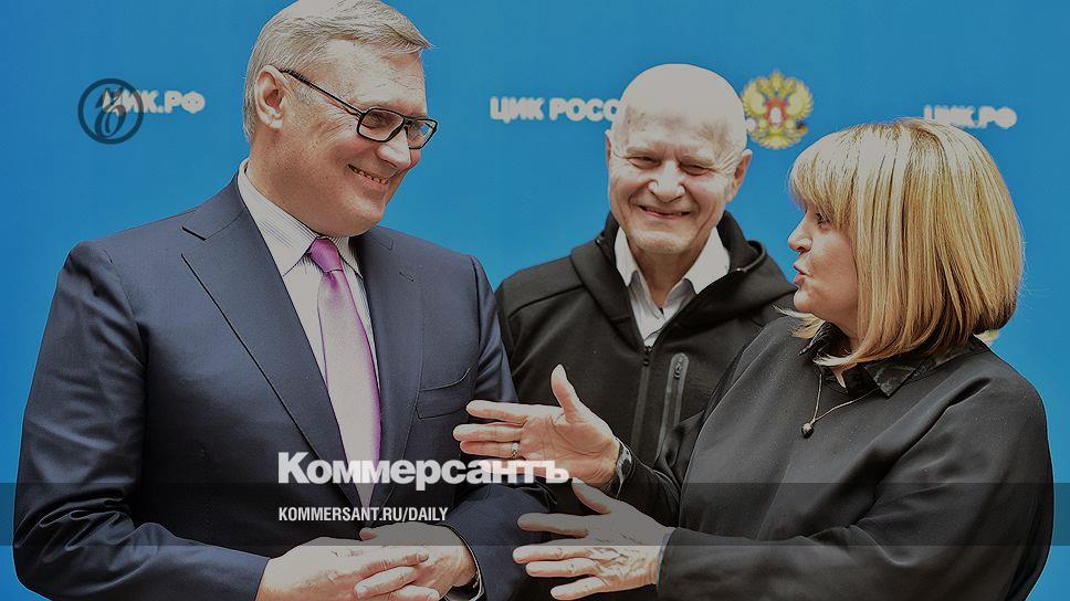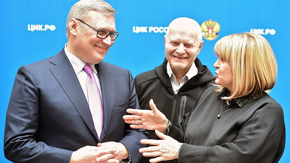 Председатель политической партии ПАРНАС Михаил Касьянов (слева), сопредседатель Московского регионального отделения партии ПАРНАС Михаил Шнейдер (в центре) и председатель Центральной избирательной комиссии (ЦИК) России Элла Памфилова (справа)