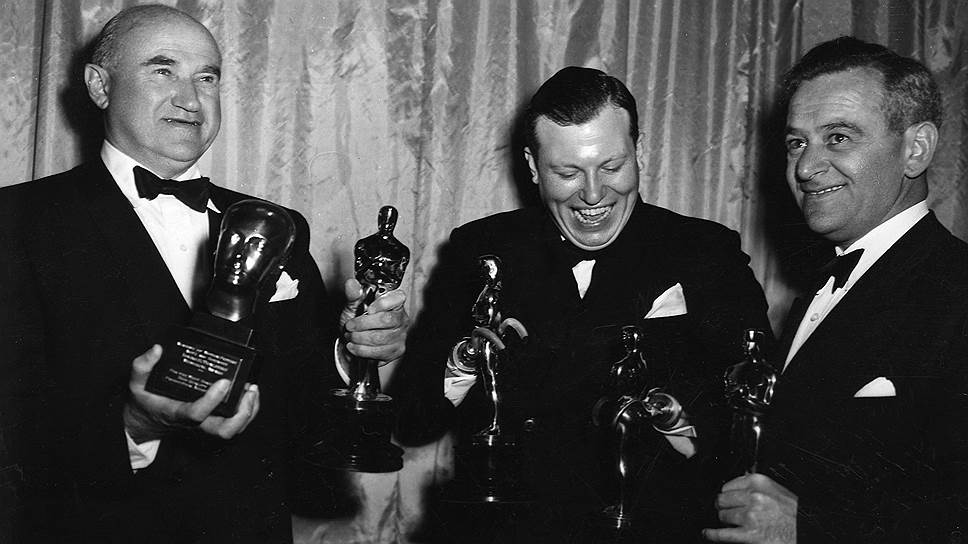 Слева направо: Сэмюэл Голдвин с «Оскаром» за лучший фильм, Гарольд Рассел с «Оскаром» за лучшую мужскую роль второго плана и Уильям Уайлер с «Оскаром» за режиссуру, 1947 год