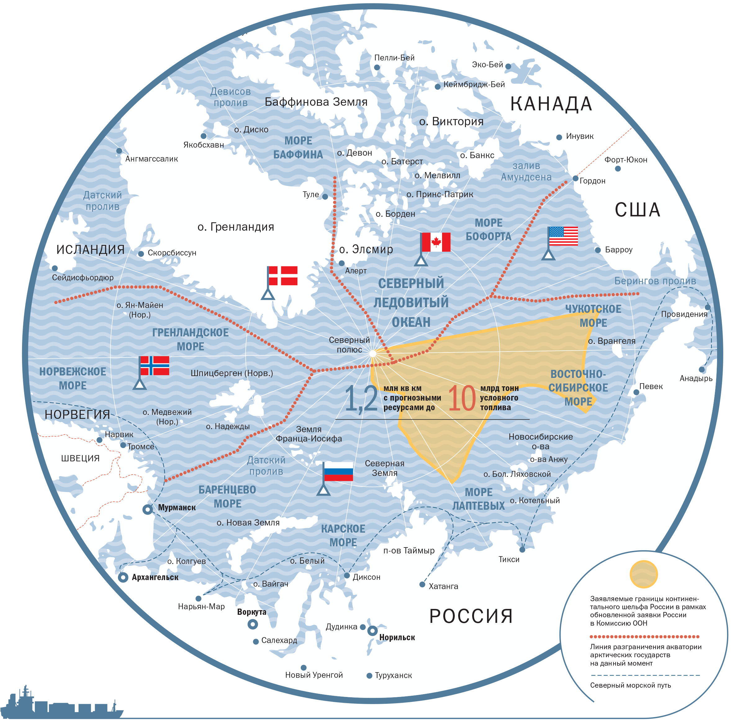 Россия первой подала заявку на расширение своего континентального шельфа в Арктике. Вслед за ней это сделали Канада, Дания, Норвегия и США. Вот основные этапы российской заявки: