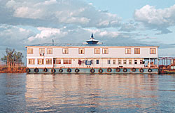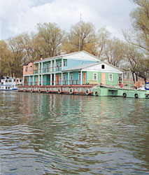 | Весной Волга выходит из берегов, поэтому многие рыболовные базы представляют собой дебаркадеры. На снимках — базы "Жемчужина", "Ольга" и "Взморье" (слева, справа, внизу) |