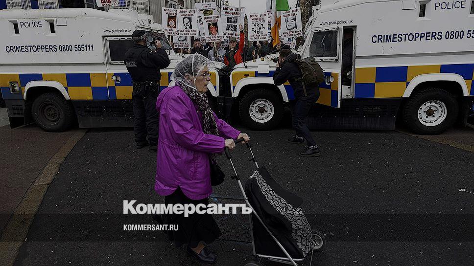 Белфаст, Великобритания. Женщина везет тележку на фоне акции бывших солдат, которые служили в Северной Ирландии