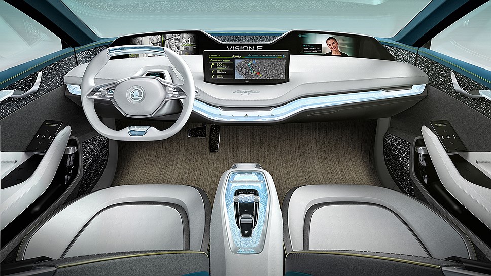 Салон Vision E оснащён четырьмя раздельными креслами, которые поворачиваются в сторону дверей для облегчения посадки-высадки. Для каждого пассажира предусмотрены отдельные экраны мультимедийной системы, а также персональная беспроводная зарядка для смартфонов. Концепт-кар получил систему полуавтономного вождения, которая способна управлять автомобилем при движении в пробках или по загородной трассе, а также в состоянии менять полосу движения. Автомобиль может самостоятельно парковаться и отслеживает состояние здоровья водителя.