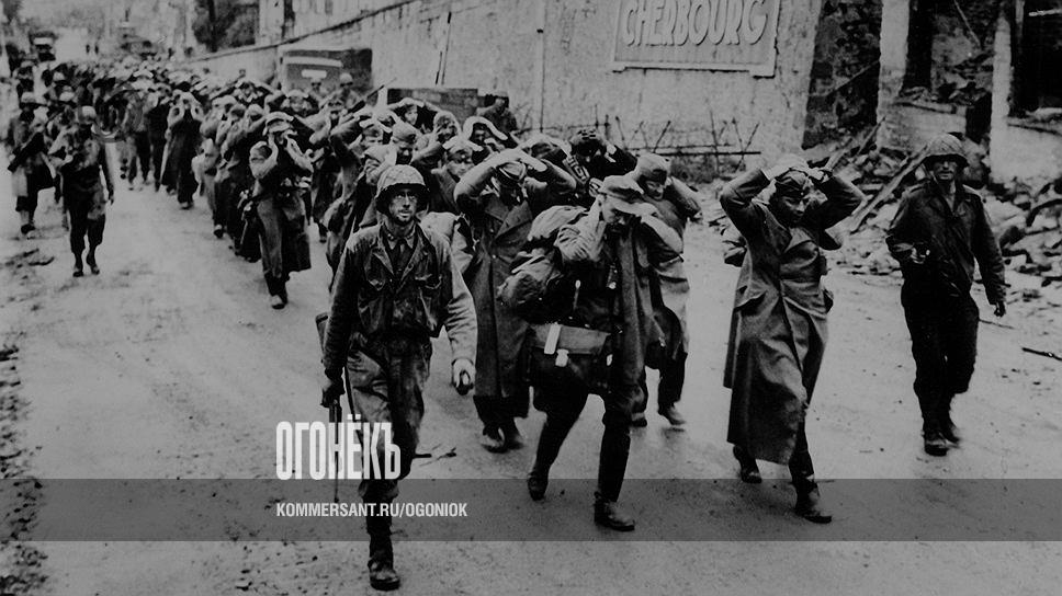 Американские солдаты ведут пленных после тяжелых боев за нормандский порт Шербур