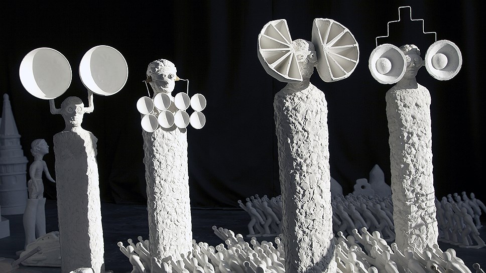 Экспозиция будет состоять из трех частей. На верхней анфиладе разместится многофигурная инсталляция Гриши Брускина «Смена декораций», внизу, в крипте — инсталляция Blocked Content группы Recycle. В последнем зале — видео Саши Пироговой.