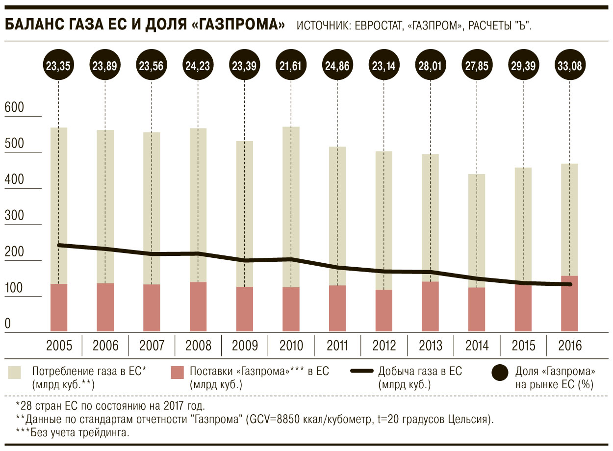 Спрос на газ в Европе стабильно снижался в течение нескольких лет, причем темпами, которые превышали сокращение собственной добычи,— иными словами, ниша для импортных поставок сжималась. При этом европейцы рассчитывали на приход крупных объемов СПГ, и некоторые страны были готовы по политическим причинам платить премию за этот газ, лишь бы не покупать его у «Газпрома». В целом создавалось ощущение, что европейские политики недалеки от того, чтобы директивно установить максимальную долю российского газа в своем импорте, «среднюю цену» и другие поведенческие условия, поставив «Газпром» перед фактом. Для этой цели мог быть использован новый механизм Энергетического союза, а также антимонопольное расследование Еврокомиссии.