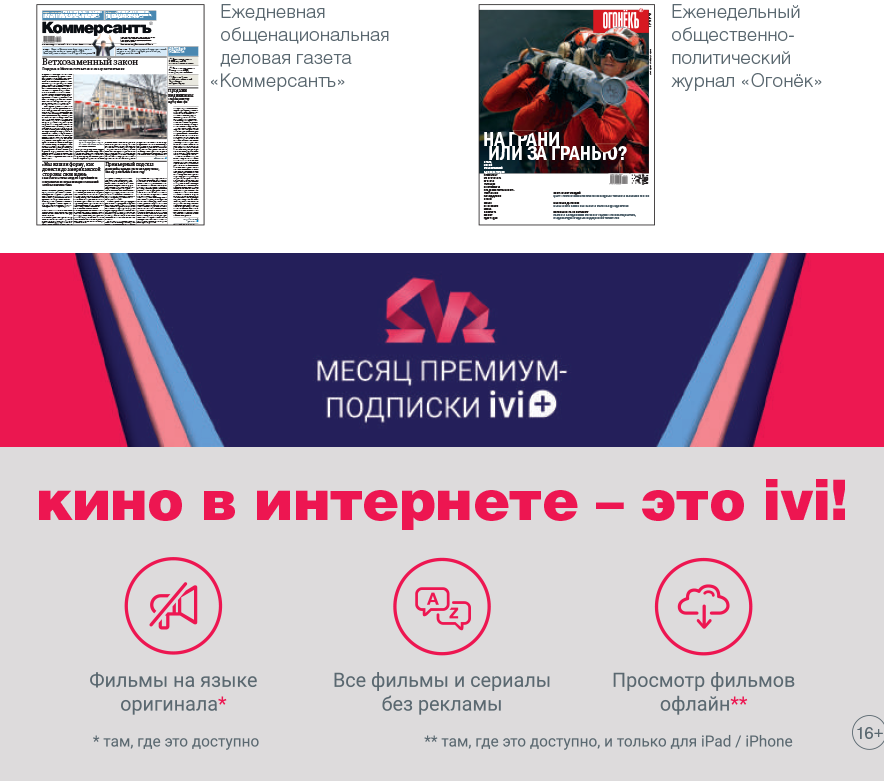 ivi – крупнейший* онлайн-кинотеатр России, которым пользуется более 27 млн человек ежемесячно. Огромная библиотека фильмов, мультфильмов и сериалов от всех голливудских студий, а также лучших европейских и российских создателей контента. Премьеры новых сериалов и сезонов – раньше, чем в эфире телеканалов: «Молодежка», «Вы все меня бесите» и многое другое. Зрителям также доступны оригинальные звуковые дорожки и субтитры. ivi можно смотреть на всех устройствах – Smart TV, web, Android, iOS и игровых приставках.
