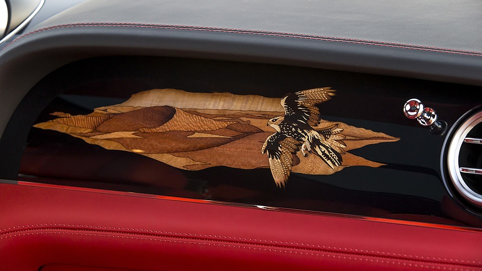 Особенностью отделки салона Bentley Bentayga Falconry является мозаичное панно, собранное вручную из 430 фрагментов шпона каштана, эвкалипта, остролиста, клена, оливы и волнистого платана. На панно, изготовление которого занимает девять дней, изображён сокол-балобан.