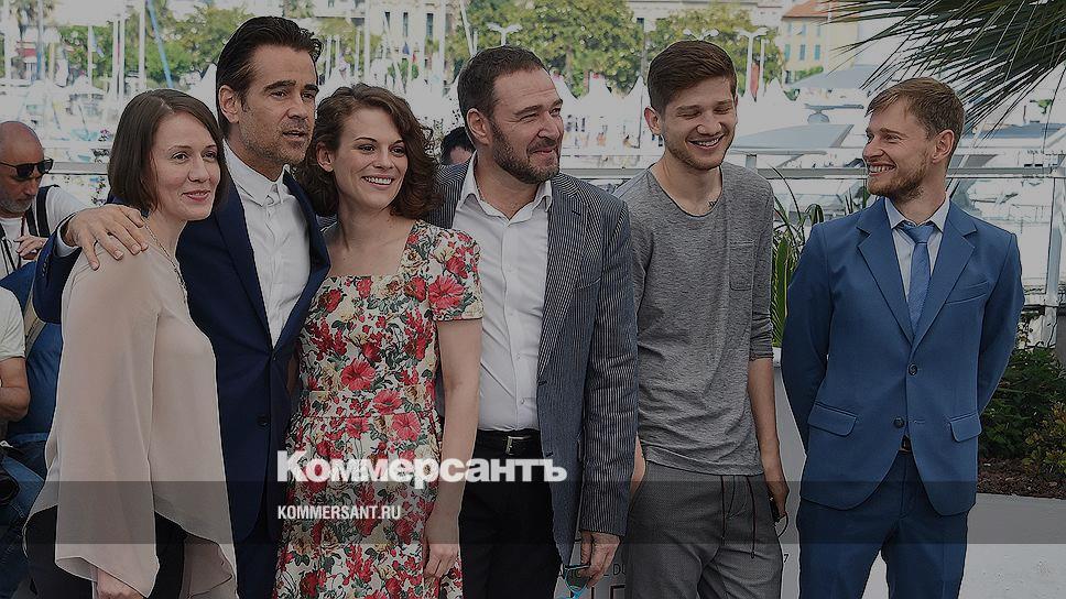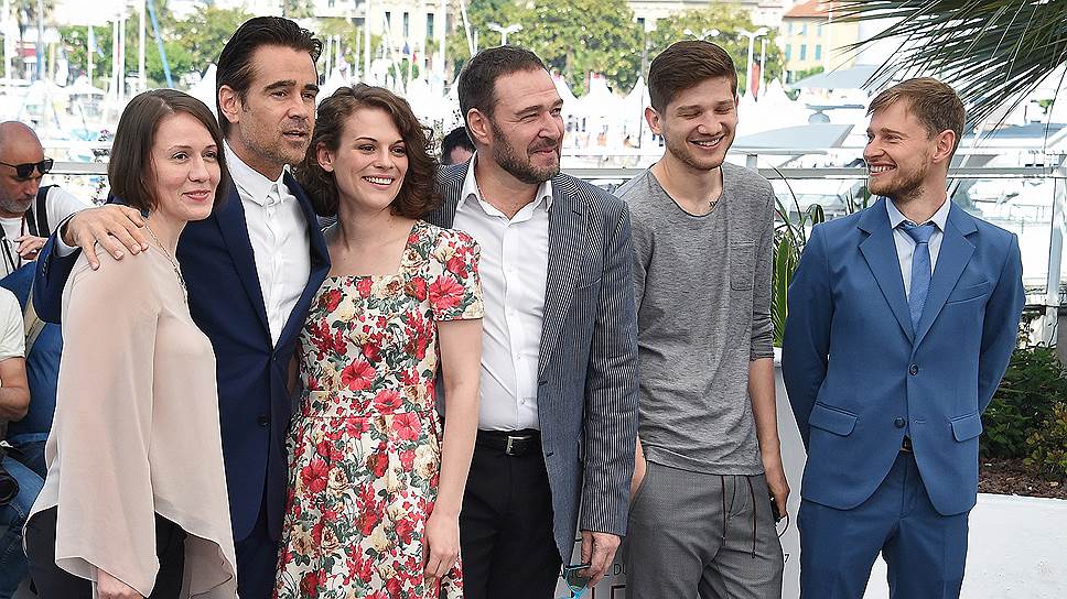 Слева направо: актеры Ольга Драгунова, Колин Фаррелл, Дарья Жовнер, Артем Цыпин и режиссер Кантемир Балагов на фотоколле российского фильма «Теснота»