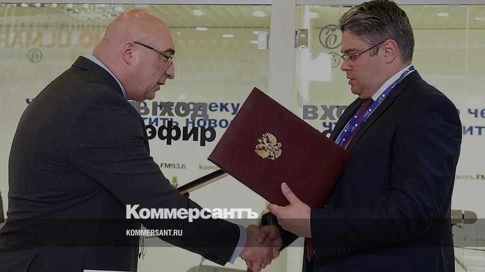 Генеральный директор УК «Металлоинвест» Андрей Варичев (слева) и заместитель Министра экономического развития России, генеральный директор некоммерческой организации «Фонд развития моногородов» Илья Кривогов