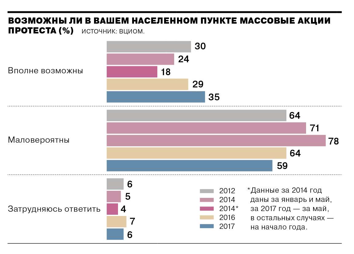 В мае 2017 года доля тех, кто говорит о возможности протестов в своем регионе, выросла до 35%. Этот показатель превышает на 5% значение пятилетней давности. Судя по опросам ВЦИОМа, ужесточение законодательства не сказалось на желании граждан выходить на улицы, когда они видят в этом необходимость.