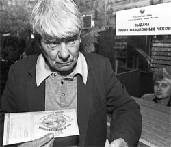 Для тех, кто забыл эти правила, напомним. Правительство РФ оценивает национальное достояние страны — активы всех госпредприятий — в 4 трлн руб. (тех еще, с Лениным). Из них 1,5 трлн руб. (35% от достояния) предназначаются к бесплатной раздаче 150 млн человек населения РФ, на каждого — 10 тыс. руб. одной бумажкой, дизайн которой заказан Deloitte Touche Tohmatsu. Ее можно: продать; обменять на акции чекового инвестиционного фонда (ЧИФ) и затем получать от него ежегодный дивиденд; самостоятельно обменять на акции какого-то предприятия в ходе чекового аукциона. Аукцион — главный момент приватизации. Каждое акционирующееся предприятие должно выставить на продажу не менее 29% акций за ваучеры. Граждане вольны менять ваучеры на акции любого предприятия. Если на 29% акций, скажем, "Газпрома" будет подан один ваучер-заявка хоть ЧИФом, хоть физическим лицом, его владелец получает 29% акций. Если десять заявок — каждому по 2,9% акций. И так далее.
