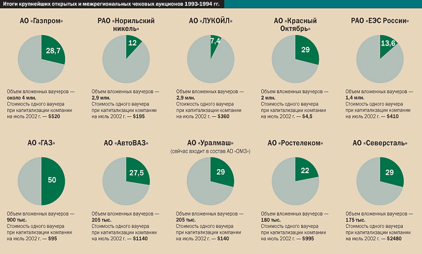 ЧИФам доверили свои ваучеры 25 млн российских граждан. Около 40 млн населения вложили свои бумаги в акции самостоятельно — и кое-кто, например сотрудники "Ростелекома", вполне сейчас могут рассчитывать на две "Волги", обещанные Анатолием Чубайсом за ваучер. Впрочем, представители класса "инвесторов" заранее входили в игру в ваучерную приватизацию с четкой целью: получить крупные пакеты акций крупных предприятий. И добились этого многие.
