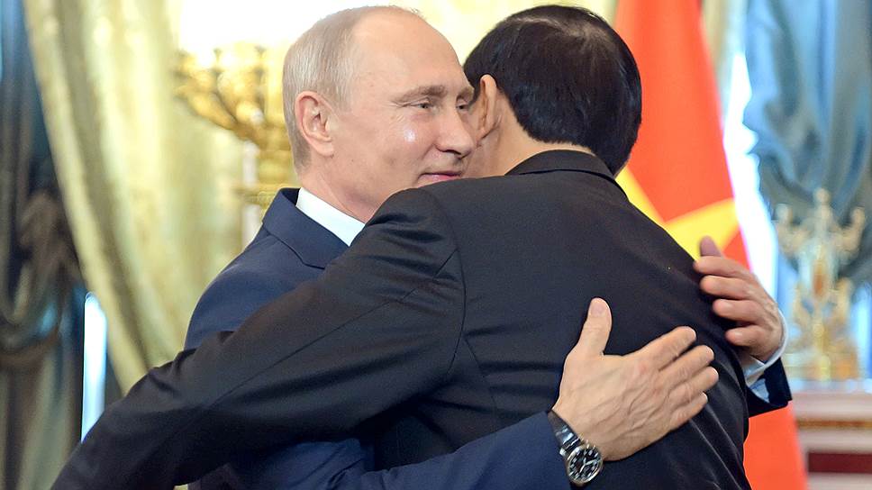 Так что, увидев президента Вьетнама в дверях Зеленой гостиной Большого Кремлевского дворца, Владимир Путин подошел к нему и, хотя тот готов был с некоторой застенчивостью просто поздороваться, притянул его к себе да и обнял. А потом, когда тот решил, что пора, наверное, рассаживаться,— и еще раз. Так что в кресле Зеленой гостиной мы получили совершенно уже расчувствовавшегося президента Вьетнама.