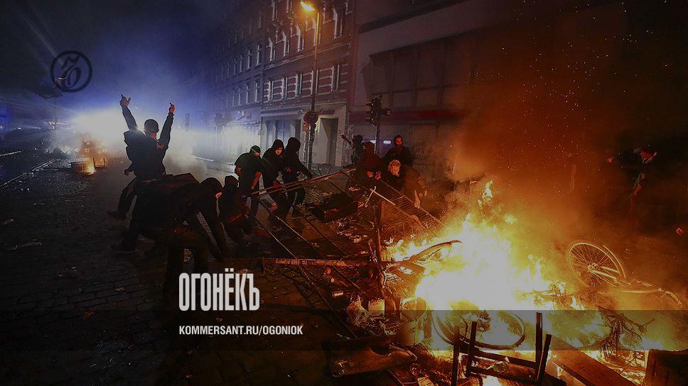 Экшен начался к вечеру, да такой, что фото хватило на всех. В двух районах Гамбурга, Алтона и Шанценфиртель, около двух тысяч радикалов из "Черного блока" устроили настоящее побоище. Они возводили баррикады, жгли автомобили, били витрины, разграбили несколько продовольственных магазинов. Более трех часов понадобилось спецназу, чтобы взять ситуацию под контроль. В ходе только этой операции 217 полицейских получили ранения различной тяжести, задержаны до 80 человек.