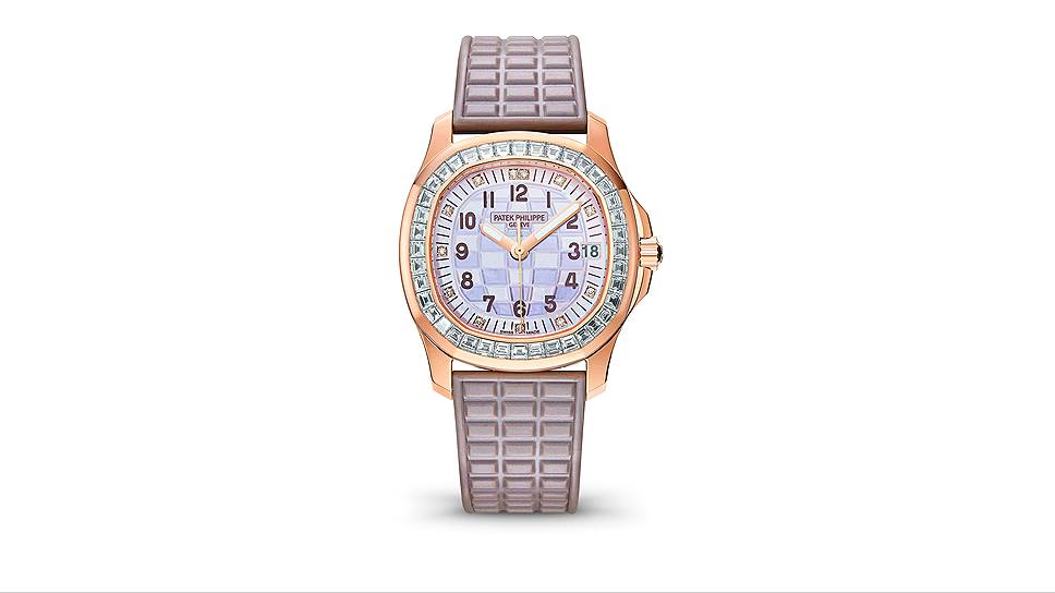 Женские юбилейные часы Aquanaut Luce Haute Joaillerie (Ref. 5072) имеют диаметр 35,6 мм — то есть для женских часов они довольно крупные. Но при этом часы эти максимально женственны, сама нежность. Механизм с автоматическим заводом имеет те же характеристики, что и у мужских часов, водостойкость тоже рассчитана на 120 м. Корпус создан из модного розового золота, его ободок декорирован 40 бриллиантами багетной огранки, в целом примерно на 2,76 карат. Циферблат перламутровый с деликатным шахматным узором, часовые метки — из бриллиантов. Раскладывающаяся застежка жемчужно-бежевого композитного ремешка Tropical украшена 10 бриллиантами багетной огранки.