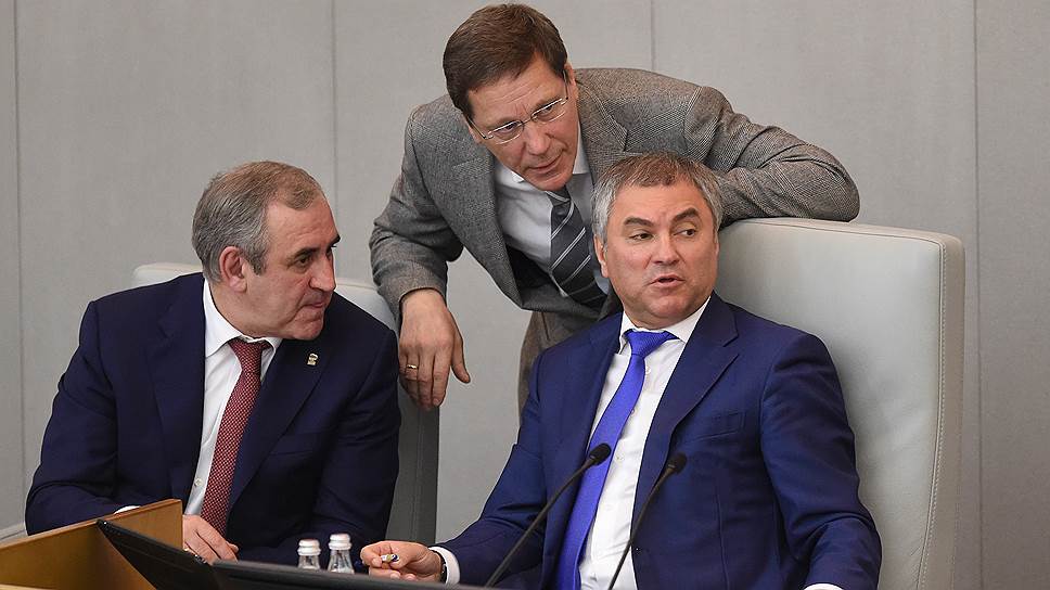 Вице-спикер Госдумы Сергей Неверов, первый вице-спикер Александр Жуков и спикер Вячеслав Володин