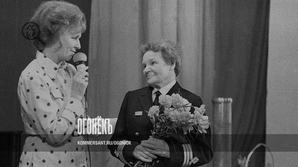 "С ее героями плакала вся страна" — так вполне официально аттестовали в свое время передачу "От всей души" (стартовала в 1972-м), которую позднее назовут прообразом нынешних ток-шоу: там встречались старые друзья, разлученные войной родственники, однополчане... Поздняя советская власть становилась сентиментальной, и ей хотелось по-стариковски выговориться или поплакать. Вела программу знаменитая дива советского ТВ Валентина Леонтьева — та самая всесоюзная "тетя Валя" из детской передачи "Спокойной ночи, малыши". На этом снимке она приветствует первую женщину — капитана дальнего плавания Анну Щетинину.