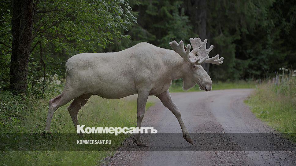 Гуннарског, Швеция. Редкий белый лось на дороге в провинции Вермланд