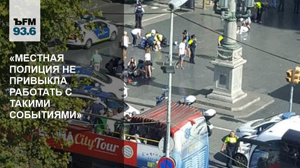 — Прямо сейчас я нахожусь в самом центре Барселоны, непосредственно рядом с местом событий. Подойти совсем близко не получается — сейчас полиция оцепила все центральные кварталы, это и Рамбла, и площадь Каталонии. Заблокирована работа метро, двух основных линий города. Остальные поезда проходят район теракта без остановок. Действительно 13 человек сейчас считаются погибшими, по последним данным. Двое террористов, двое нападавших на данный момент действительно засели в турецком баре, который находится в непосредственной близости от того места, где фургон протаранил толпу людей. На данный момент говорить, насколько хорошо или плохо полиция справляется со своей работой, конечно, немного преждевременно, потому что нужно понимать, что это Барселона, событий такого большого трагического масштаба здесь все-таки, как правило, не происходит.
