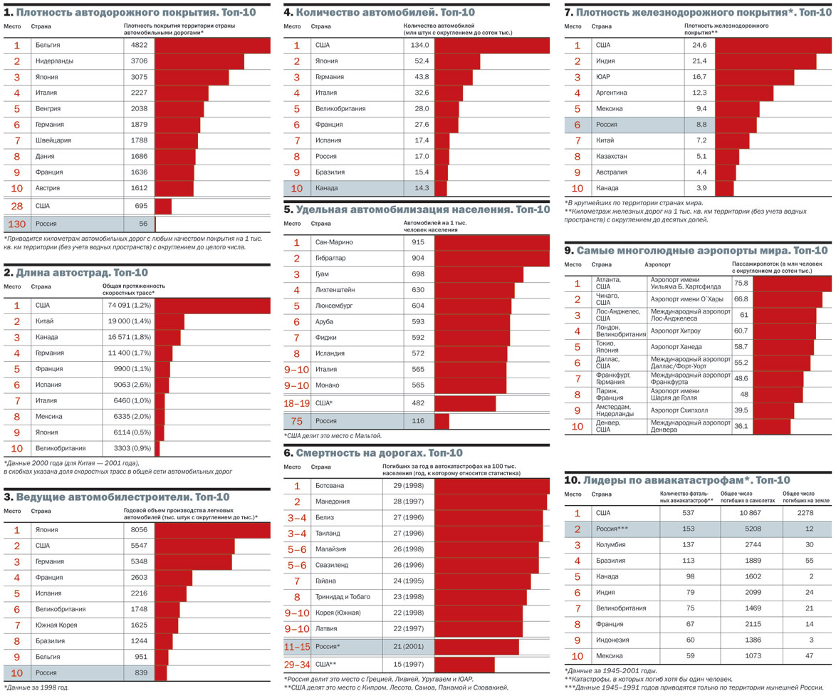 Все приведенные в статье статистические данные подготовлены в рамках проекта "Коммерсантъ-рейтинг". При этом были использованы сведения государственных статистических агентств, а также информация следующих источников: Министерство путей сообщения РФ, USA Department of Transportation, Federal Highway Administration, International Road and Transport Accident Database, ОЭСР, Motorsat, China Railways Magazine, Japan in Figures 2001, CIA The World Factbook 2001, World Bank Atlas, Indian Railways, Amtrak, IRTAD, IRF World Road Statictics, Journal of Traffic Medicine, TESU, RETA, Airports Council International, Aviation Safety Network.