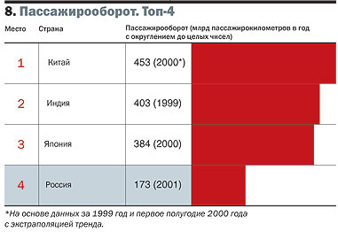 Более половины пассажирских перевозок в мире приходится на долю всего четырех государств (см. таб. 8). Тенденции темпов роста в странах "большой четверки" таковы, что единственной переменой, возможной в будущем, является выход Индии на 1-е место. Россия же в нынешних условиях, скорее всего, никуда со своего 4-го места не сдвинется — ни в одну сторону.