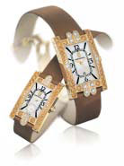 Менее броские часы представлены Carrera y Carrera. Это часы с прямоугольным корпусом из белого золота, с белыми и шоколадными бриллиантами pave, на рыжем кожаном ремешке. На циферблате изображены головы двух лошадей.