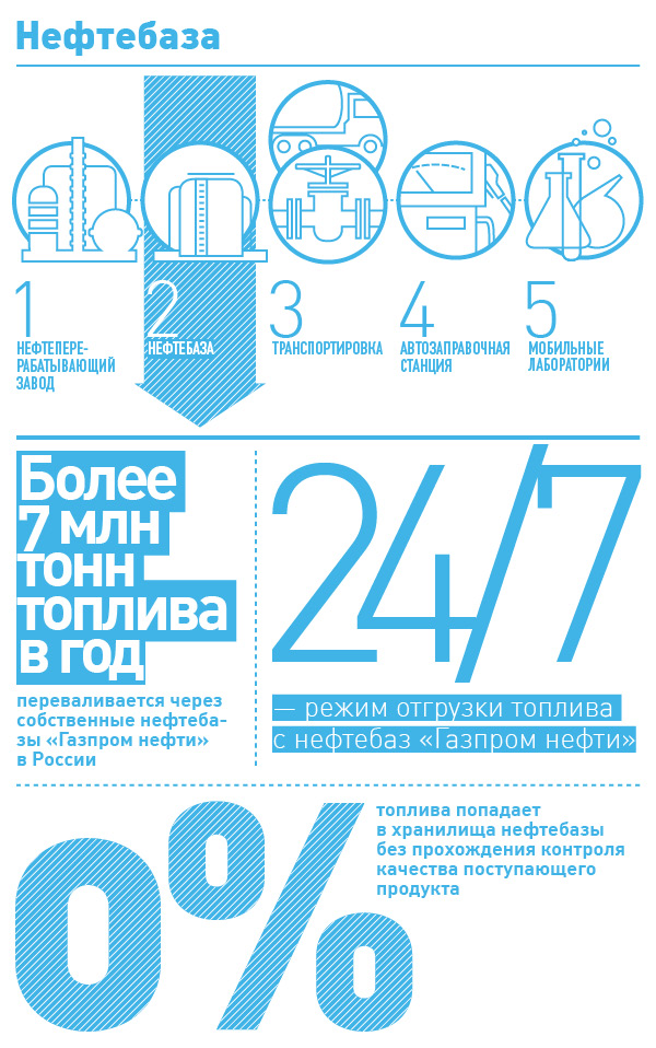 На своих нефтебазах «Газпром нефть» использует строгую процедуру контроля качества. Топливо, поступающее на предприятие в цистернах по железной дороге, в обязательном порядке проходит проверку в стационарной лаборатории. До тех пор, пока специалисты не подтвердят соответствие продукта действующим стандартам, его не сливают в резервуары. Более того: поскольку в хранилища попадает топливо из разных цистерн и поставок, перед началом реализации из заполненного резервуара его параметры обязательно проверяются вновь, и на каждую партию выпускается паспорт качества.