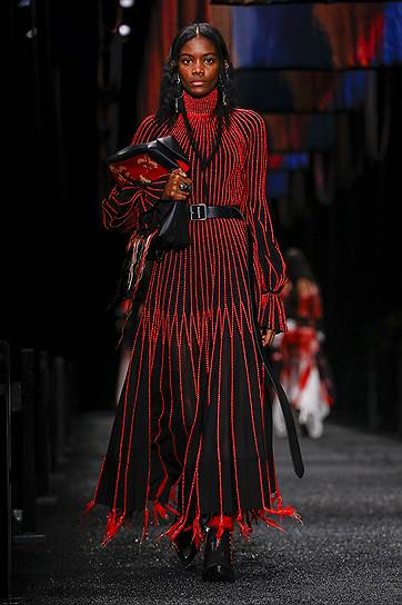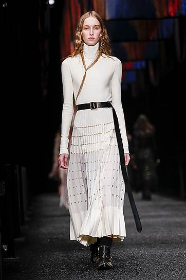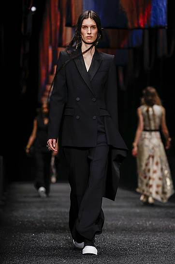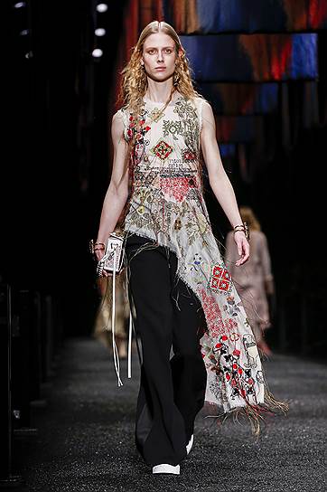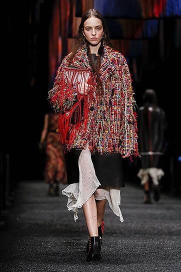 Корнуолл известен не только своей английской сельской романтикой, но и тем, что в этом графстве можно до сих пор обнаружить отголоски языческих верований. Именно здесь растут священные деревья, на которые принято завязывать ленты с просьбами об исполнении желаний. Они и вдохновили Сару Бертон на создание коллекции нынешнего сезона. Эта идея вполне маккуиновская — волшебство всех коллекций, созданных самим Александром Маккуином, было основано в том числе и на его обостренном мистическом чувстве. К колдовству, ведовству и легендарным созданиям он обращался постоянно. Но в нынешних коллекциях марки трагического ощущения сверхъестественного рядом уже, естественно, нет. И в этот раз коллекция вполне витальна. Это просто романтическая красивая одежда с оберегами. Вещи сшиты из кожи и овчины, твида и шелка — и ленточек, которые нашиты на пальто, свободно свисают с дубленок, стягивают талии и сплетаются с полосами твида в пестрые платья. Особенно эффектно все эти ленты выглядят в движении, так что коллекция при использовании простых строгих силуэтов получилась по-настоящему динамической. Кроме ленточек у Alexander McQueen есть кружева с изображением серебристых деревьев, петчворк с сердцами и поцелуями, пейзажи и животные со средневековых гобеленов, вышитые солнце, звезды и луна. Все очень романтично, нежно, молодо и при этом вполне безопасно. И платья, и жакеты, и пальто безупречны по крою, отлично сидят и выглядят прелестными.