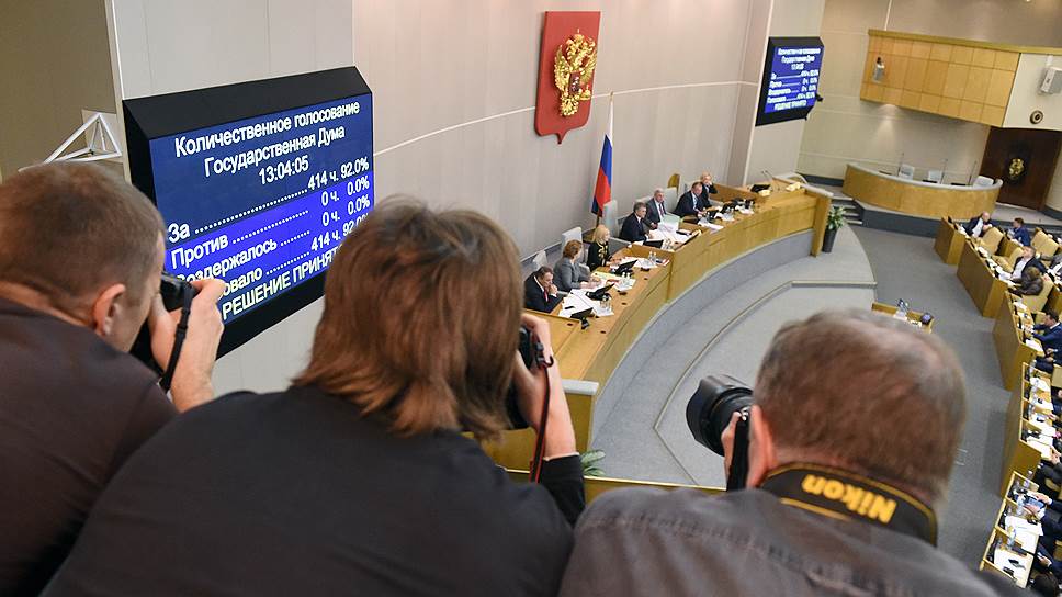 Депутаты Госдумы единогласно (414 голосами присутствующих на заседании) проголосовали за принятие в третьем чтении законопроекта, согласно которому иностранные СМИ, получающие финансирование из-за рубежа, могут быть признаны в России иностранными агентами. Законопроект был разработан в ответ на признание американского филиала RT иностранным агентом «для зеркального ответа» США (см. “Ъ” от 10 ноября). Совет федерации уже пообещал незамедлительно одобрить принятый закон и отправить его на подпись президенту.