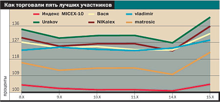 Тройка же лидеров за период с 9 по 15 октября осталась прежней, причем участники, занявшие первые два места, вообще не совершали сделок. Лидирует Urakov с абсолютным доходом 40,67%. Urakov продолжает держать в портфеле акции РАО ЕЭС (последнюю сделку он совершал 8 октября, докупив 1300 акций РАО). Прирост его портфеля с прошлого вторника составил 6,5%. Причем наиболее значительное увеличение произошло 15 октября, когда акции РАО подорожали на 6,43%, а доход Urakova вырос почти на 11% по сравнению с предыдущим днем. На втором месте участник NIKalex с абсолютным доходом 35,8%. Его портфель также не изменился: 41 500 акций РАО ЕЭС.