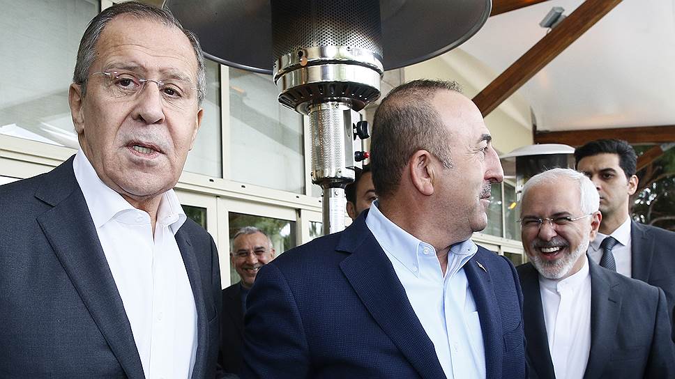 Главы МИД России, Турции и Ирана обсудили сирийское урегулирование в курортном Белеке — без галстуков. Слева направо: глава МИД России Сергей Лавров, Турции — Мевлют Чавушоглу и Ирана — Мохаммад Джавад Зариф
