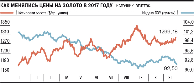 Повышение цен на драгоценные металлы происходило на фоне снижения курса доллара США. Вчера индекс DXY (курс доллара относительно шести ведущих мировых валют) снижался на 0,3%, до 92,496 пункта — минимального значения с 25 сентября. Двухмесячный максимум обновил и курс европейской валюты, который вырос на 0,25%, до отметки $1,196. Ослаблению американской валюты способствует опубликованный на прошлой неделе протокол последнего заседания ФРС — он показал, что регулятор обеспокоен низким уровнем инфляции. «Участники рынка начали сомневаться в том, что ФРС выполнит свой прогноз, предполагающий три повышения ставки в 2018 году. Теперь более вероятным сценарием представляются два повышения. Но при этом рынок по-прежнему уверен в повышении ставки на 25 базисных пунктов на заседании 13 декабря»,— отмечает стратег по операциям на товарно-сырьевых рынках Sberbank CIB Михаил Шейбе.