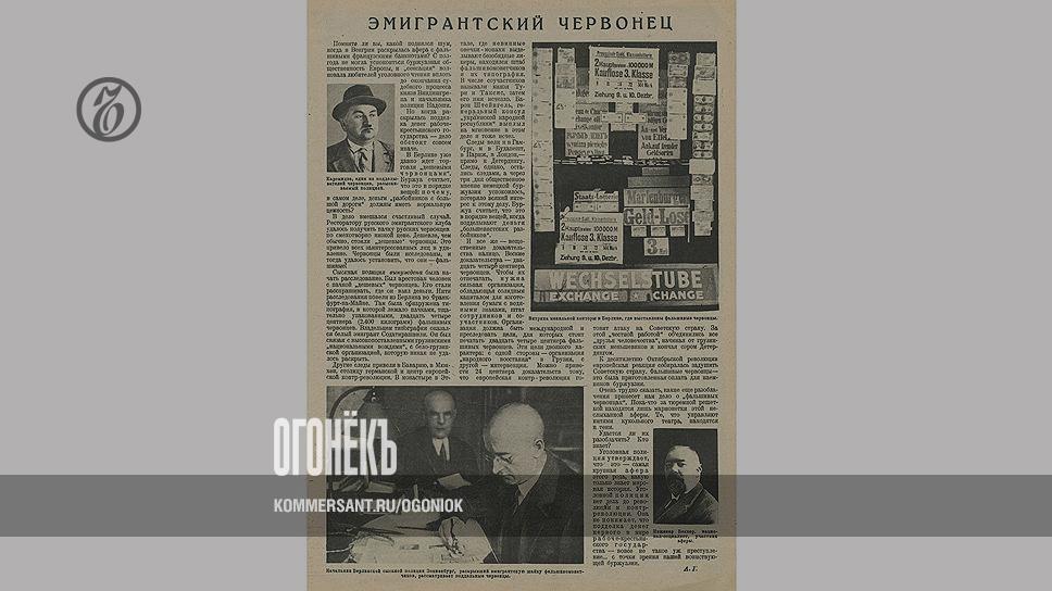 90 лет назад "Огонек" рассказывал о массовой подделке советских червонцев за границей. Все началось с того, что полиция в Берлине наткнулась на массовую продажу по бросовым ценам фальшивых советских червонцев. Журнал даже опубликовал витрину меняльной конторы в Берлине, где были выставлены на продажу поддельные червонцы. Занявшись этим делом, немецкая полиция обнаружила во Франкфурте-на-Майне типографию, где лежали пачки свеженапечатанных советских денег — всего 24 центнера. Владельцем типографии оказался беглый эмигрант Содатирашвили, связанный с националистическим движением в Грузии. Расследование "привело в Мюнхен, центр европейской контрреволюции. В монастыре Эттале, где невинные овечки-монахи выделывают безобидные ликеры, находился штаб фальшивомонетчиков и их типография". В числе участников называли князя Тури и барона Штейнгеля, генерального консула "украинской народной республики". Следы организации фальшивомонетчиков вели в Париж, Гамбург, Будапешт, Лондон — "прямо к Детердингу", нефтяному магнату и известному антисоветчику, чьи нефтяные месторождения в Азербайджане были национализированы советской властью. На фальшивые деньги должна была финансироваться смена режима в Грузии и Украине, отторжение их от Советской России, а потом и поход на СССР. "К десятилетию Октябрьской революции европейская реакция собралась задушить Советскую страну. Фальшивые червонцы — это была приготовленная плата для наемников буржуазии".