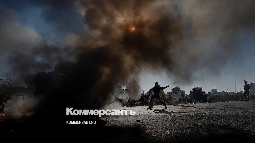 Рамалла, Западный берег реки Иордан. Один из протестующих палестинцев закидывает солдат и полицию камнями