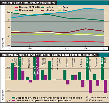 Отметим, что участники конкурса восприняли смену лидера на ура и сразу же принялись "топтать" Urakovа. Вот характерный (при этом — один из самых вежливых) комментарий из помещенных на форуме на сайте конкурса: "Парень (Напористый.—'Деньги') действительно достоин приза. Было бы несправедливо, если бы выиграл инвестор (Ураков). Конкурс трейдерский, и взять приз должен был тот, кто успешно сочетает интрадей и трендоследование". И еще: "Про Urakovа. Тогда получилось бы, что приз достался не за умение, а за удачу, как в лотерее. Видно же, что человек не умеет ничего — как продал РАО, так все его операции бессмысленны и убыточны. Я очень рад, что приз достанется не ему!"