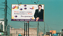 Первый раз народ содрогнулся от смеха в 1999-м, когда скромные плакаты "Рома думает о семье — семья думает о Роме" с портретом никому не известного джентльмена семито-хамитской наружности были расставлены как раз по предполагаемому пути следования неприметного работника "Сибнефти" Романа Абрамовича. Не провисели они и двух дней — оказалось, образ нефтяника был использован некорректно и без лицензии. Но похоже, заказчик своего добился — в полном соответствии с принципами свободы слова он скептически высказался по поводу места некоего Ромы в теневой русской политэкономии. Или просто выплеснул немалый ушат собственной зависти по поводу этого теплого места.