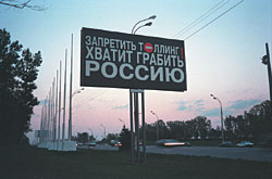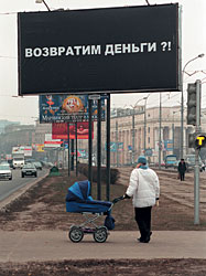 При этом вроде бы ничего рекламного в ней нет. Вот только что по всему городу разбросало билборды глубоко оптимистичного черного цвета с надписью: "Вернем деньги?" Никаких контактных и прочих инфоматериалов замечено не было, что говорит о том, что это, скорее всего, не банк и не попавшие на деньги ростовщики-частники. Похоже, мы стали свидетелями какой-то политической кампании с неявным заказчиком. Эта акция продолжает новую традицию — наружной некоммерческой и, может быть, даже неполитической рекламы в стране.