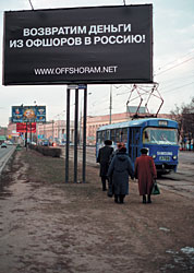 Кстати, как мы и предполагали, в один прекрасный день — или темную ночь? — в первых числах декабря смутное предложение от анонима возвратить деньги сменилось конкретным предложением вернуть средства из офшоров на родину. Более того, домен с интернет-адресом www.offshoram.net на плакатах явственно говорит о направленности акции. За рекламной выходкой замаячила тень правительства, о чем нам в неофициальных беседах намекают люди из окружения министра финансов. Стало быть, мы становимся свидетелями любопытного явления — инструментами воздействия на психику клиента, которыми пользовались раньше только отдельные олигархические граждане и группировки, теперь пользуется государство.
