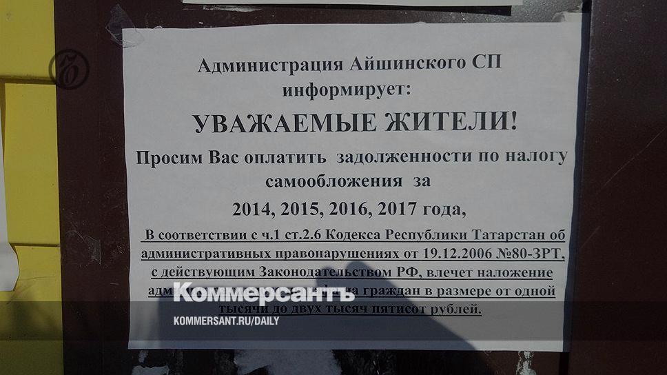 Житель поселка Уруссу Ютазинского района Татарстана получил уведомление (копия есть у „Ъ“) о необходимости явиться в местную административную комиссию «по факту неуплаты самообложения». Об этом „Ъ“ сообщил координатор «Голоса» по республике Михаил Тихонов. В комиссии считают, что местный житель совершил правонарушение по ч. 1 ст. 2.6 КоАП РТ «Неисполнение муниципальных правовых актов органов местного самоуправления». Статья предусматривает предупреждение либо штраф от 1 тыс. до 2,5 тыс. руб. В комиссии подчеркнули, что в случае неявки жителя «протокол об административном правонарушении будет составлен» без его участия. Референдум о самообложении в Уруссу проходил 19 ноября прошло года. 51,5% участников плебисцита (явка составила 50,6%) проголосовали за самообложение в размере 300 руб. на строительство тротуаров в поселке и асфальтирование дороги до кладбища.