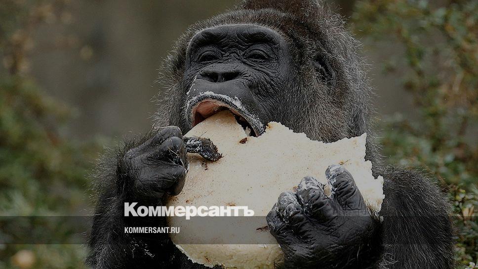 Берлин, Германия. Горилла ест праздничный пирог в местном зоопарке