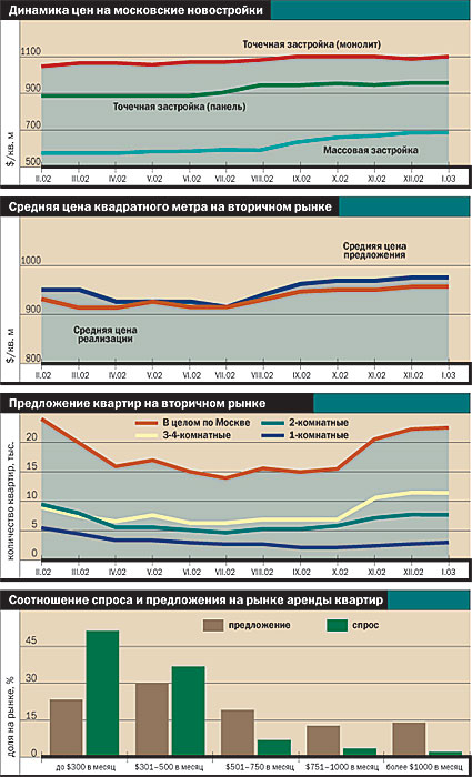Итоги 2002 года оказались ожидаемыми. В 2001 году цены взлетели на 30-35%, и никто из риэлтеров не сомневался в том, что они будут расти и дальше. Спрос на новостройки остался высоким, однако к началу 2002 года перестал быть ажиотажным. Поэтому никто из риэлтеров не верил, что форсированные темпы роста предыдущего года сохранятся. Максимальный рост предполагался на уровне 15-20%. Строители рассчитывали на большее — 25-30% — и на протяжении всего года активно пытались оправдать собственные ожидания, повышая цены на квартиры в каждом новом доме. Покупатели ответили снижением спроса и покупкой более дешевых квартир в ближнем Подмосковье. Тем не менее рост цен все-таки состоялся. По мнению аналитика Московской ассоциации-гильдии риэлтеров (МАГР) Олега Репченко, столичные новостройки сейчас стоят на 15% дороже, чем год назад.