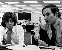 | Исключительная упертость журналистов The Washington Post Карла Бернстейна (внизу) и Боба Вудворда (вверху) довела Ричарда Никсона до отставки |